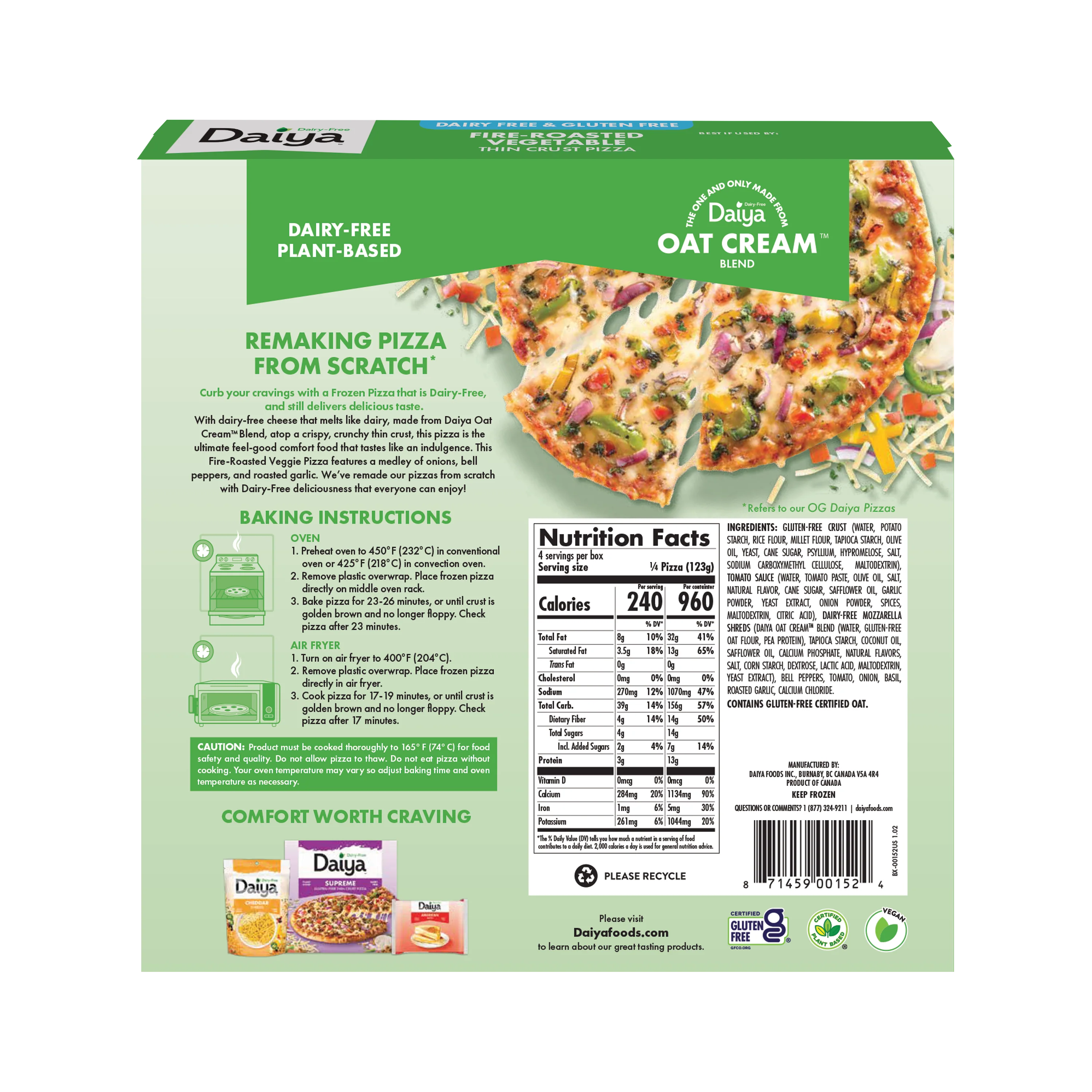 It’s official: veggies are not just for salads. This pizza is topped with flavorful onions, bell peppers, and roasted garlic, all paired with a crispy crust and herby tomato sauce, and smothered in dairy-free mozzarella. You can consider your cravings satisfied.